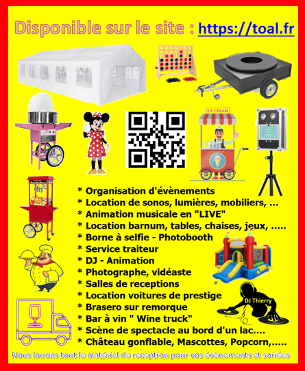 Tout le matériel et le mobilier pour organiser vos évènements festifs : mariage, anniversaire, soirée privée, départ en retraite, etc…………….